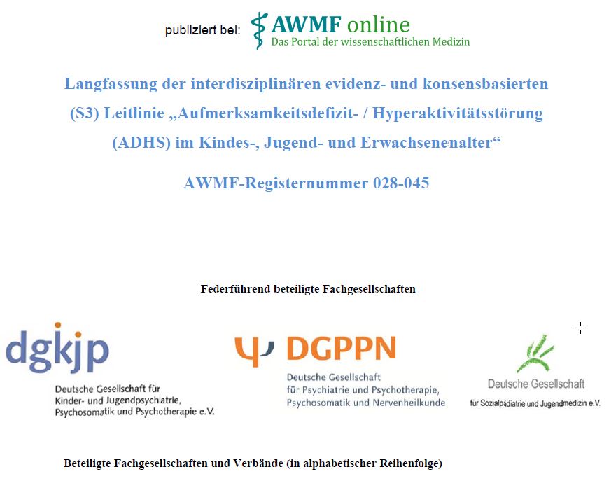 Banaschewski (Leitlinienkoordination), Tobias (2017): S3 Leitlinie Aufmerksamkeitsdefizit- /Hyperaktivitätsstörung. Deutsche Gesellschaft für Kinder- und Jugendpsychiatrie; Deutsche Gesellschaft für Psychiatrie und Psychotherapie; Deutsche Gesellschaft für Sozialpädiatrie.